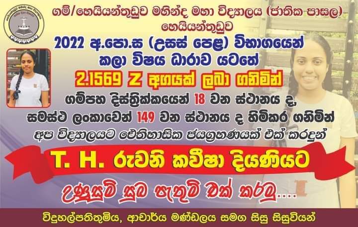 2022 අ.පො.ස. (උසස් පෙළ ) විභාගයෙන් කලා විෂය ධාරාව යටතේ ගම්පහ දිස්ත්‍රික්කයෙන් 18 වන ස්ථානය ලබා ගත් දියණියට උණුසුම් සුභ පැතුම්..........................